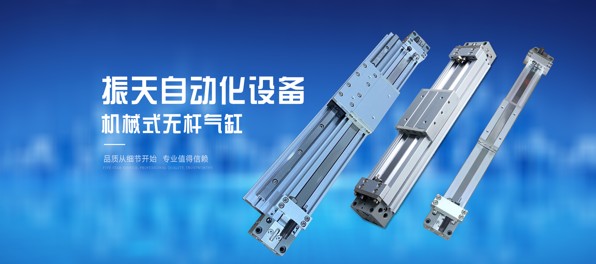 樂清市振天自動化設備有限公司是一家集設備研發、制造、銷售為一體的氣動元件生產公司。主要生產氣動元件,電動元件及輔助配套系統元件:機械無桿氣缸,電動滑臺,電動手指電缸等。產品性能優良,規格齊全。公司秉承著“堅持創新務實,質量至上,優質產品,優質服務”的原則,以科技為 向導,以人才為后盾,精益求精,從而獲得客戶的一致贊賞。公司坐落于電器之都樂清市柳市鎮前洲工業區,歡迎廣大的新老客戶來電來人參觀咨詢。